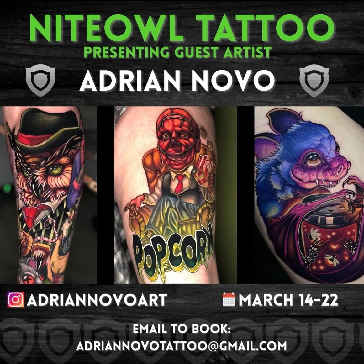 Niteowl Tattoo features a crew of incredibly talented award-winning artists that produce detailed custom work. You can browse the portfolios of our resident artists including Timmy B, Lindsay Baker, Patrick Quirk, Rios, and Roxy P - as well as some of the frequent guest artists that will be visiting our shop. Follow us on Instagram and Facebook to see what our artists are posting on a daily basis, as well as our main shop pages that features our resident artists’ work, guest artists, and photos of the shop! Be on the lookout for special functions within the community and charity events!